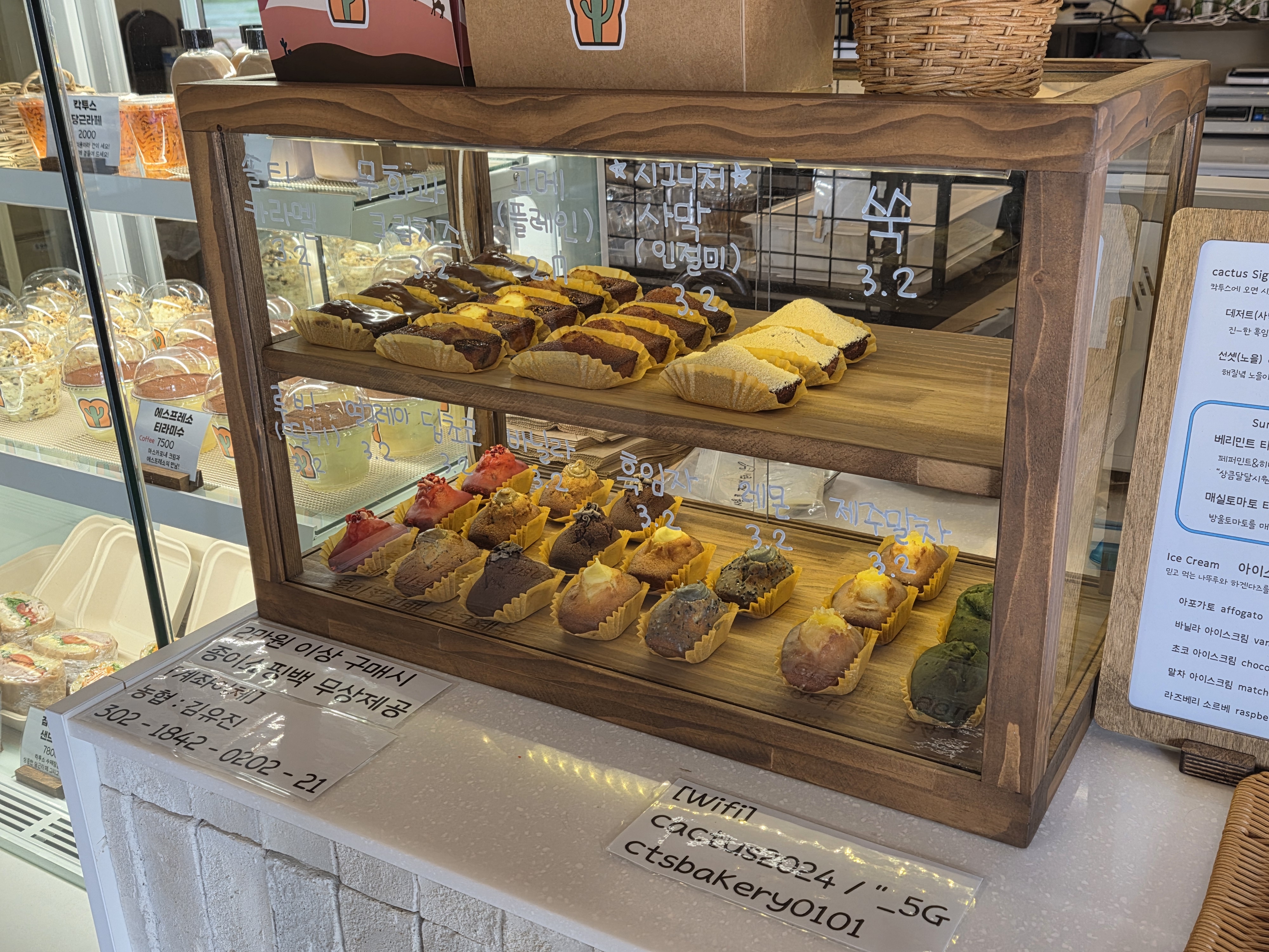 화이트 톤 인테리어에 원목 진열장이 포인트. 선인장 로고가 곳곳에 보여 캐릭터 있는 공간이에요. 진열이 깔끔하고 쇼케이스/오븐빵/구움과자 코너가 분리돼 있어 동선도 편했습니다.